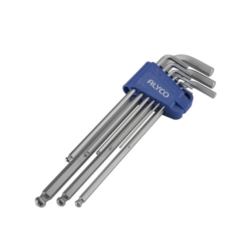 Juego de llaves acodadas hexagonales Allen con punta de bola esférica en medida de pulgadas. Longitud extralarga. Juego de 9 piezas ideales para la industria, reparaciones, mantenimineto industrial, taller de automóvil, hogar o garaje. Estas llaves Allen tienen una gran durabilidad y resistencia al desgaste por estar fabricadas en Acero al Cromo-Vanadio. El perfil de bola esférica consigue mayor superficie de contacto con la pieza, pudiendose ejercer mas fuerza sobre la tuerca. Se suministran en un soporte de plástico para su almacenamiento ordenado, donde se marca la medida de cada llave.